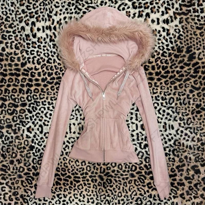 Women's 2025 Gothic Aesthetic Autumn Winter Fur Collar Hoodie Casual Slim Chic Design Cardigan Sweatshirt 2000s Harajuku Clothes